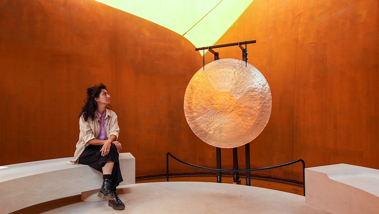 Visitors approach the retreat by descending a gently curving pathway that guides them below ground. The movement is deliberate — a gradual withdrawal from the everyday. Soft sounds echo through the curved XCarb steel walls, made with a high proportion of recycled and renewable material. The air cools. The light shifts.