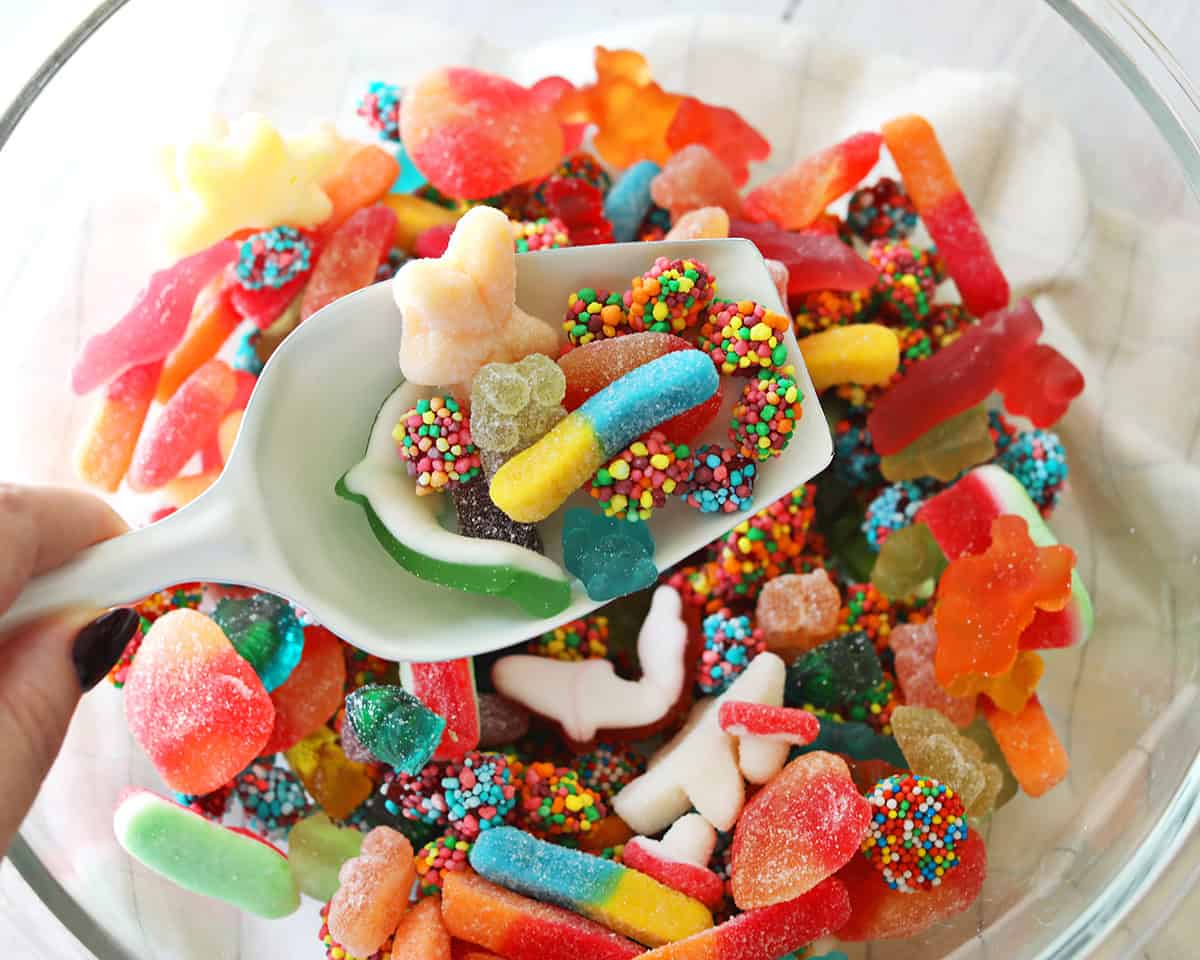 If you have any long candies such as sour straws or nerds rope, cut them into smaller pieces before adding to the mixture.