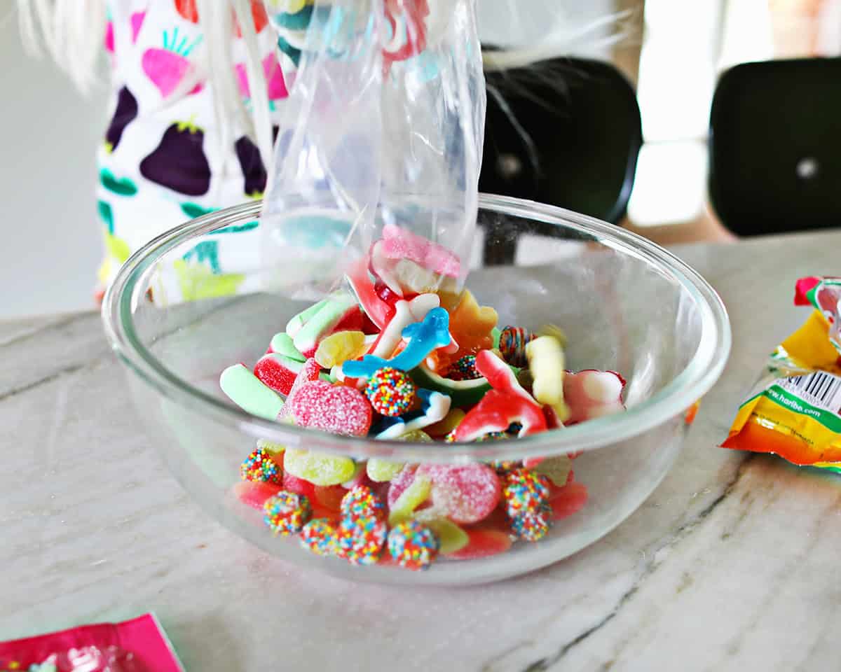 Important note: Substitute any favorite gummy candies of your own. Eyeballing the ingredients is sufficient and anything goes.