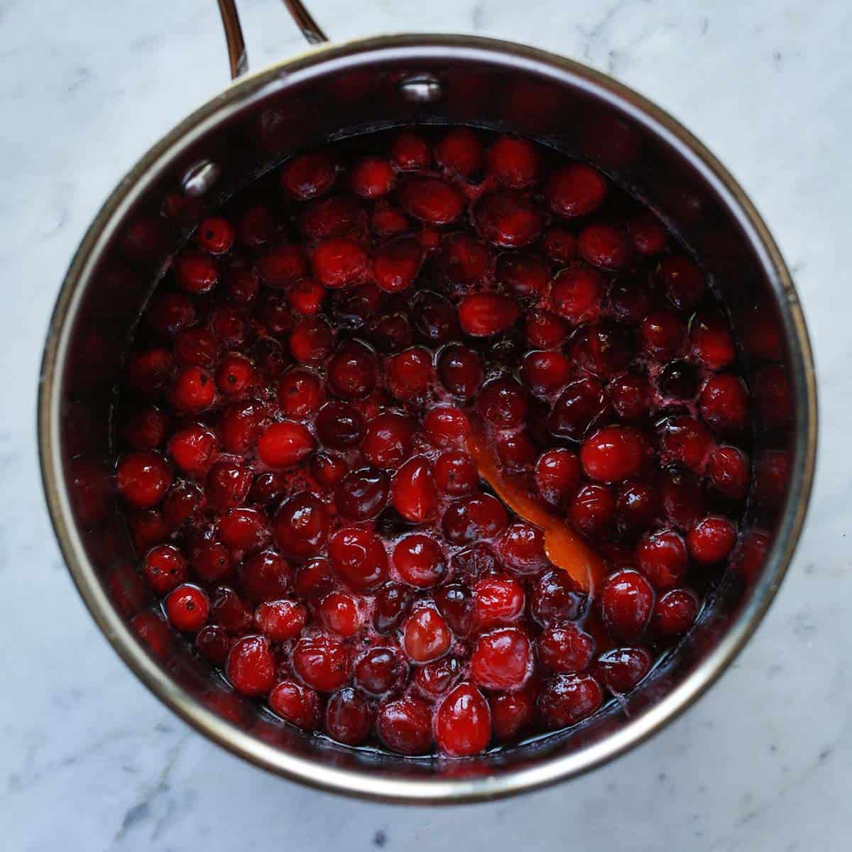 Add the cranberries and orange peel and cook over medium/high heat until the cranberries begin to burst (3-5 minutes).