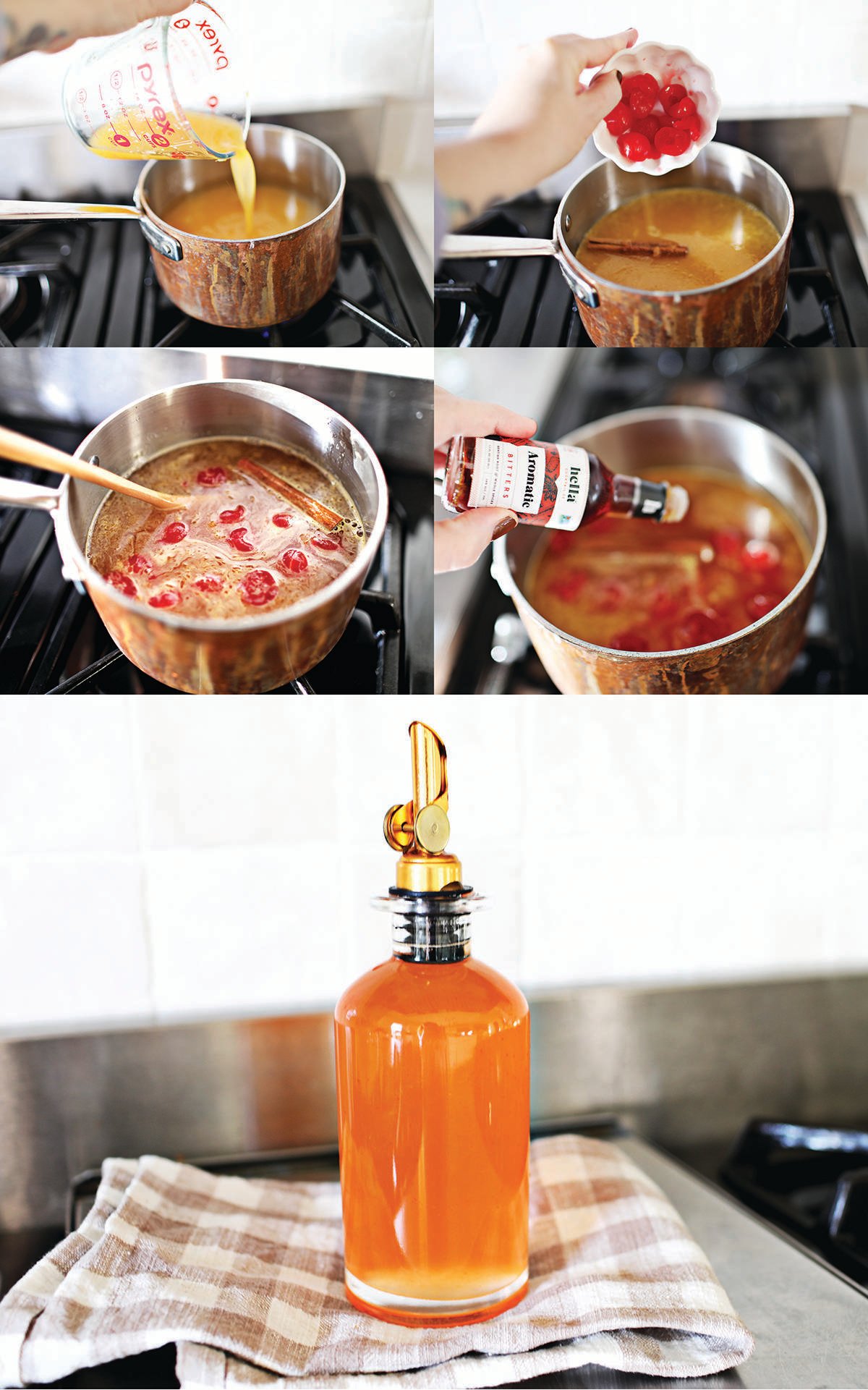 In a sauce pan, combine 3 cups sugar, 2 cups water and 1 cup freshly squeezed clementine juice (I used 5 clementines and a citrus juice hand press to juice them. Next, add 5 maraschino cherries cut into halves and stems removed. Add one cinnamon stick. Let the mixture simmer on medium heat until the sugar has completely dissolved into the water.