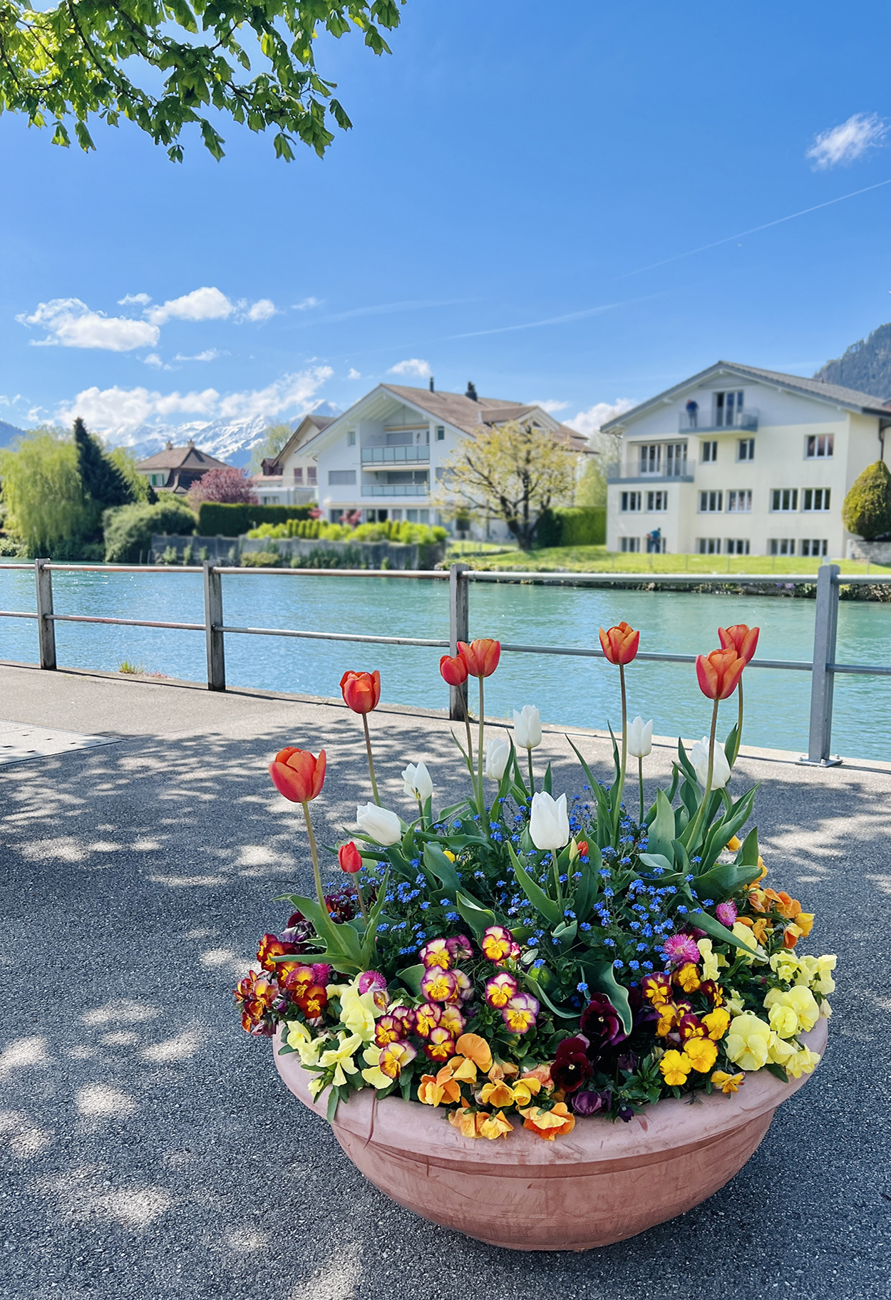 We rode a very scenic train from Zurich through Bern down to the Interlakken Valley. Your eyes can’t even take in the scenery, it’s incredible. Little Swiss chalets, sheep and cows, a valley of vivid green filled with flowers in bloom. You’ll notice my obsession with the cement flower pots around town. Whomever is responsible for the flower beds around town deserves an award in gardening. 🙂