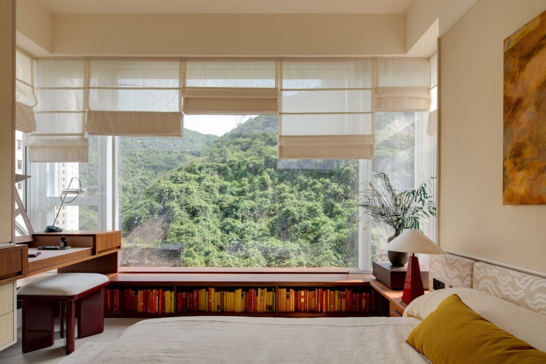 In the principal bedroom, a low-lying bookshelf made from walnut veneer runs the length of a picture window.