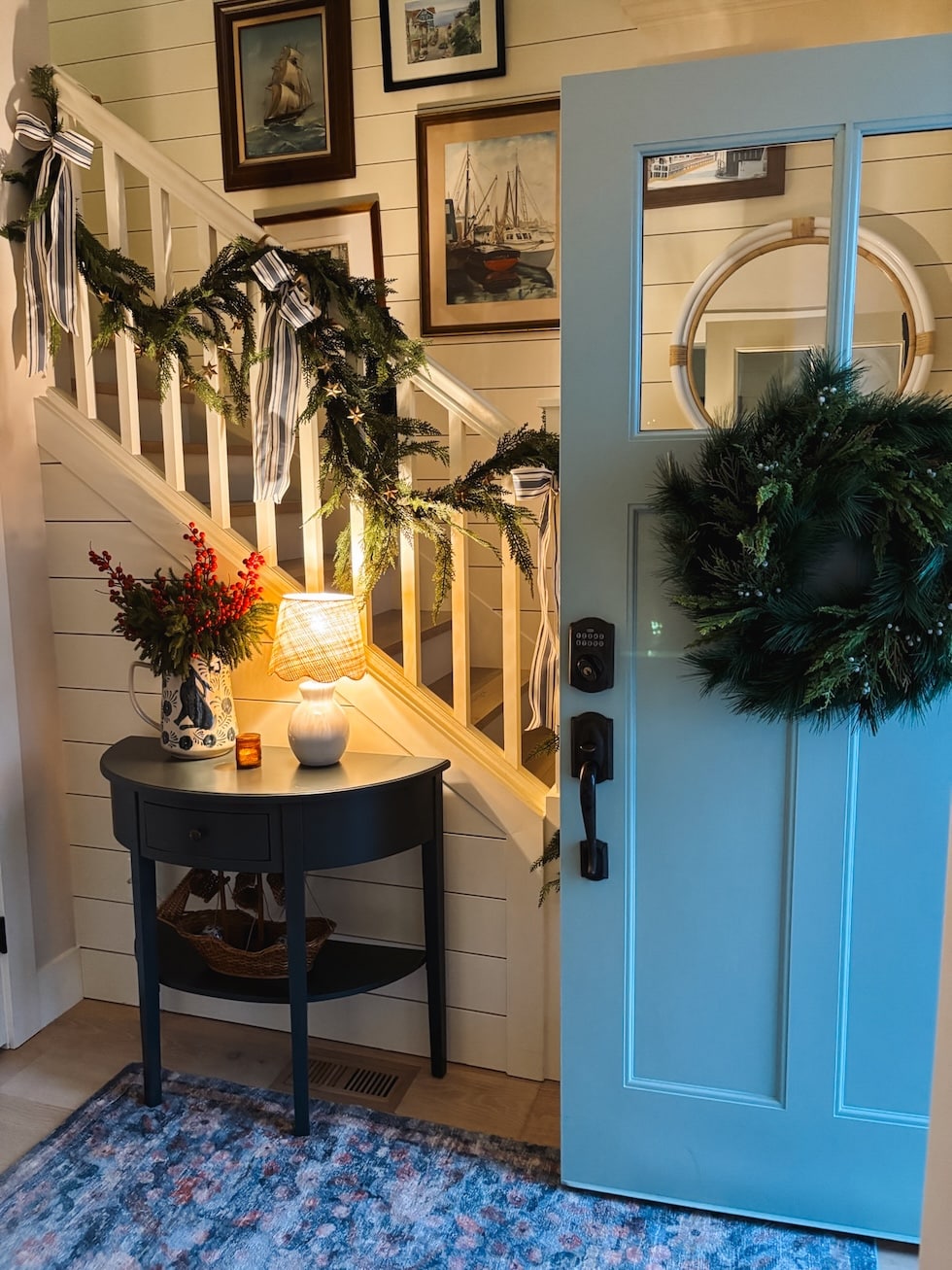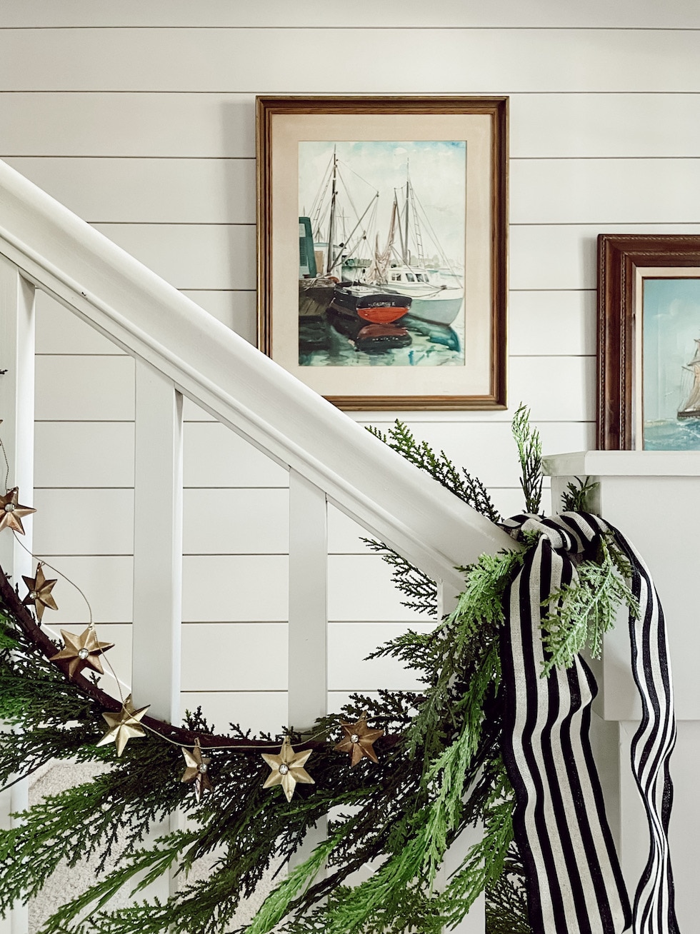 Our staircase is very small. We keep the decor pretty simple, so I don’t have a lot of heavy garland hang, but here’s what I do.