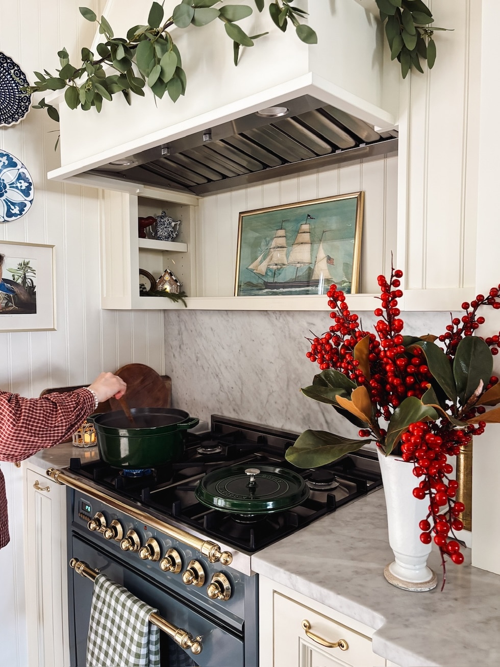 For my stove hood garland I bought these hooks that have a sticky back. I put one hook on each side of the hood on the flat ledge (although you could put it anywhere depending on the style of your hood). I’ve done this for the past two years and it has worked perfectly!