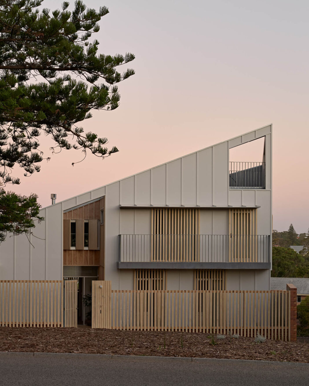 Externally, timber shutters and cutouts modulate privacy and manage sun exposure, as the rooftop solar panels, a water tank, and a heat pump also aid the home’s low energy consumption.
