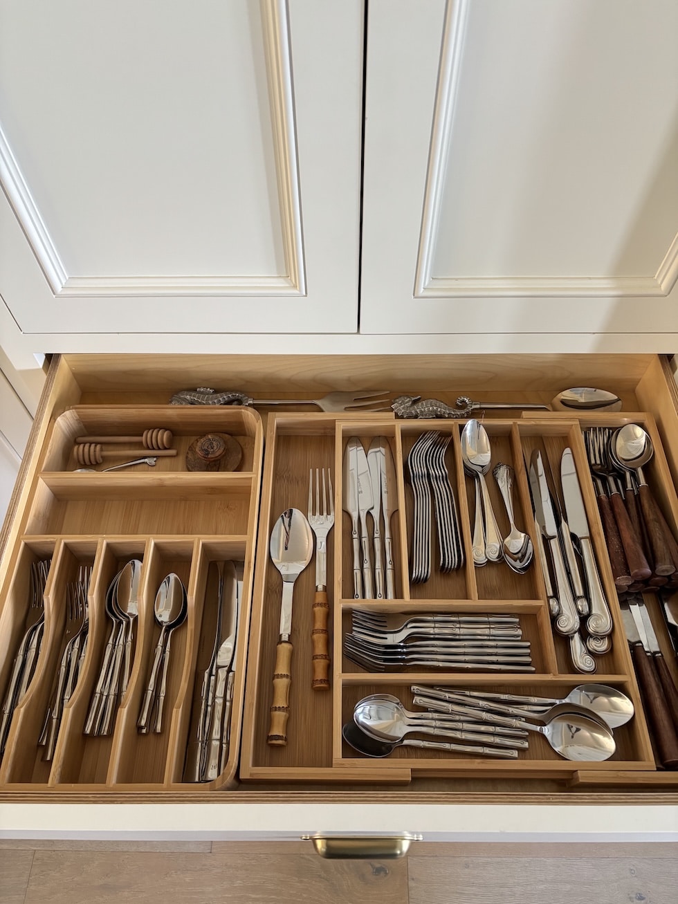 This drawer was previously full of tea which didn’t really feel like the best use of space. It’s a shallow drawer which is ideal for flatware, so I decided to make a switch! We had a couple of sets of pretty stainless flatware (with bamboo detail!) that I like to use for holidays and entertaining that didn’t have a convenient or organized spot, so this location made a lot more sense. It’s right across from the table!